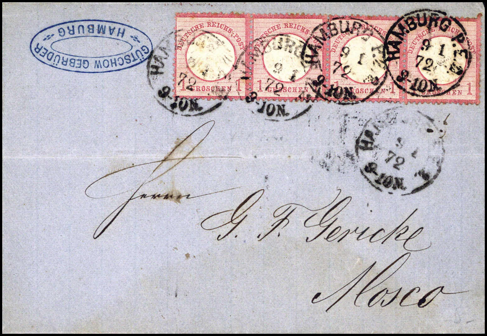 1 Gr., waagr. Viererstreifen, bis auf zwei verkürzte Zahnspitzen in tadelloser Erhaltung auf sauberem, blauem Faltbrief nach Moskau, klare K1 HAMBURG B.E.2 9/1 72, Fotobefund Krug BPP ("seltener Brief der 1 Gr.-Marke aus der