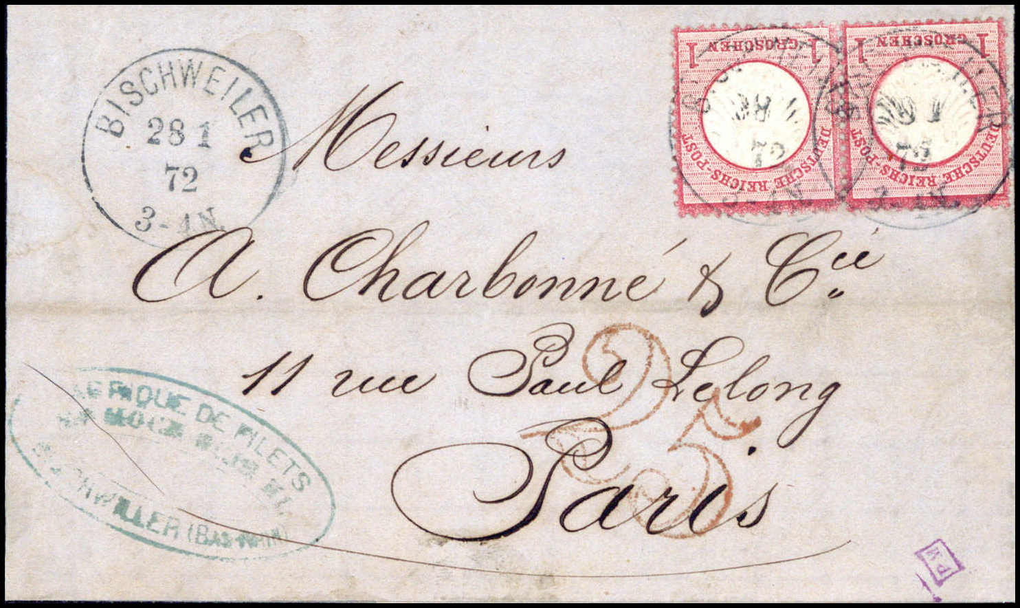 1 Gr., waagr. Kabinettpaar mit zentr. K1 BISCHWEILER 28/1 72 in Doppelfrankatur mit rotem, franz. Taxstempel "25" auf sauberem, kl. Faltbrief nach Paris. Rote französische Taxstempel sind sehr selten, Fotobefund Krug BPP