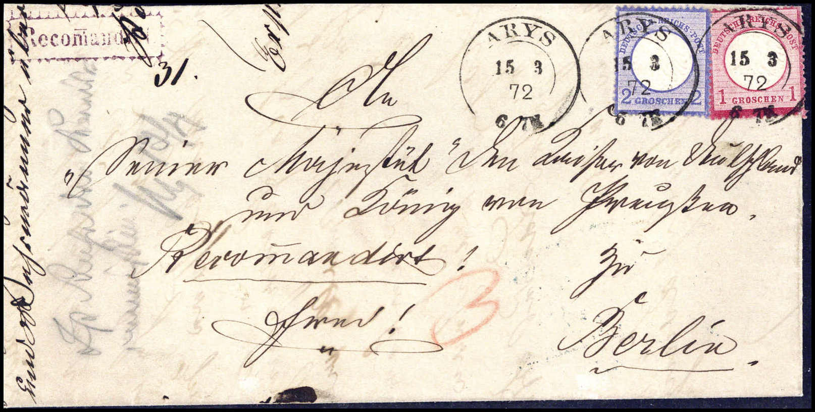 Preussen zu Berlin". Klare und zentr. aufgesetzte K2 ARYS 15/3 72 sowie beiges. violetter R1 "Rekommandirt", rs. blauer R3 BERLIN CABINETS-EXPEDITION. Es sind nur wenige Briefe an den Deutschen Kaiser erhalten geblieben, der vorliegende