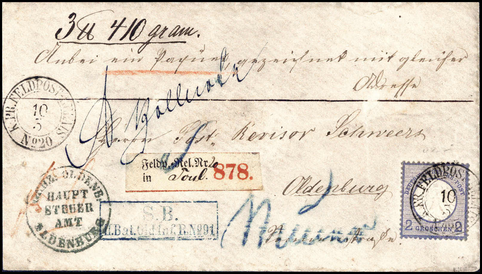 ½ Gr., Viererblock mit 2 Gr. ultramarin rs. und vs. auf Feldpost-Paketbegleitbrief nach Oldenburg (Marken u. Umschlag sauber repariert und eine Marke abgefallen). Sauber aufges. K2 K.PR.FELDPOST-RELAIS No.20 nebst entsprech. Paketzettel