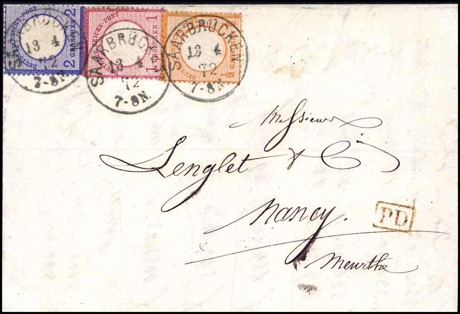 ½ Gr. mit 1 Gr. karminrosa und 2 Gr. blau auf aktenfrischem Kabinettbrief nach Nancy, schöne K1 SAARBRÜCKEN 13/4 72, Fotoattest Sommer BPP