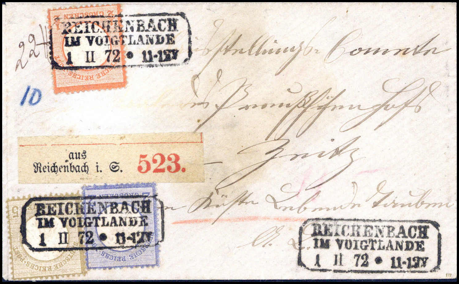 ½ Gr. mit 2 Gr. ultramarin und 5 Gr. ockerbraun, Kabinett-Dreifarbenfrankatur auf schönem, kl. Paketbegleitbrief nach Zeitz, klare R3 REICHENBACH IM VOIGTLANDE 1/2 72, Fotobefund Sommer BPP