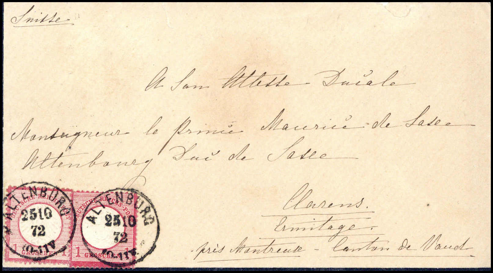 1 Gr. mit 1 Gr. karmin, gr. Schild als außergewöhnliche Frankatur-Kombination in leuchtend frischer Farbe und übl. Zähnung auf sauberem Brief in die Schweiz (oben kl. Öffnungsfehler gestützt), klare K1 ALTENBURG 25/10 72, Fotoattest
