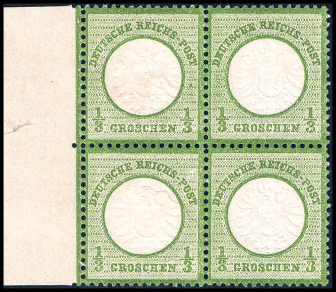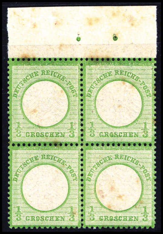 1/3 Gr., postfrischer Viererblock (Gummi getönt) vom Oberrand, dort mit Anlagepunkten