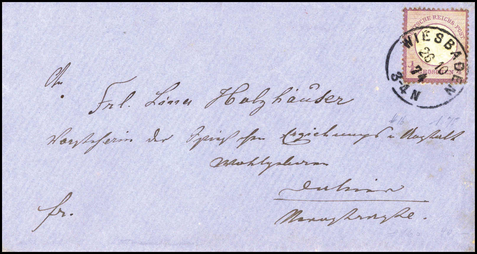 ¼ Gr., tief geprägtes Kabinettstück mit klarem K1 WIESBADEN 26/10 74 als seltene Einzelfrankatur auf schönem, blauem Ortsbrief. Katalogpreis: 700,-