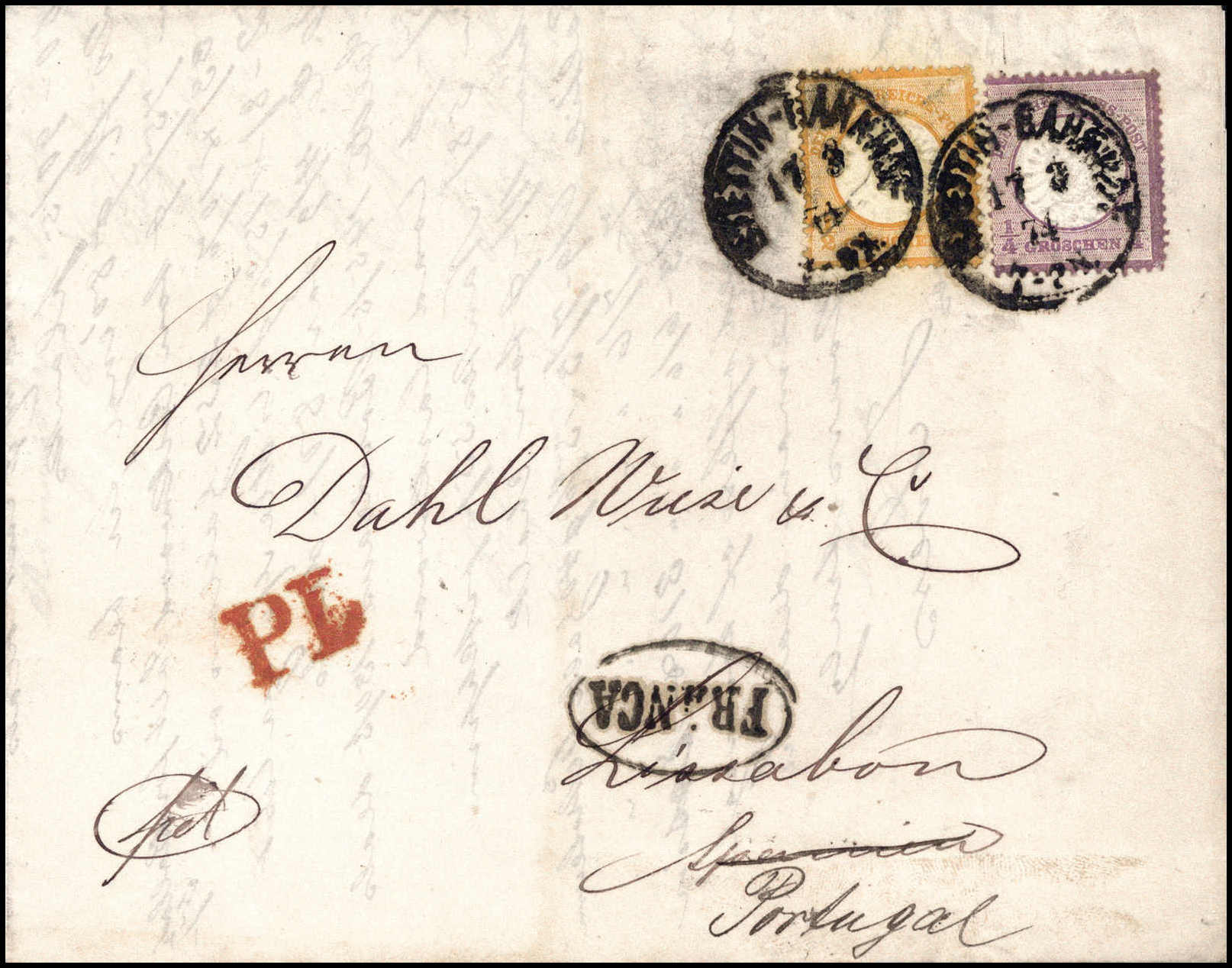 Drucksache nach Portugal: ¼ Gr., Kabinettstück mit ½ Gr. orange (winz. Aufklebefältchen) auf Drucksache mit K1 STETTIN-BAHNHOF 17/3 74 nach Lissabon. Schon normale Briefe nach Portugal sind schwer zu finden, als Drucksache eine Rarität