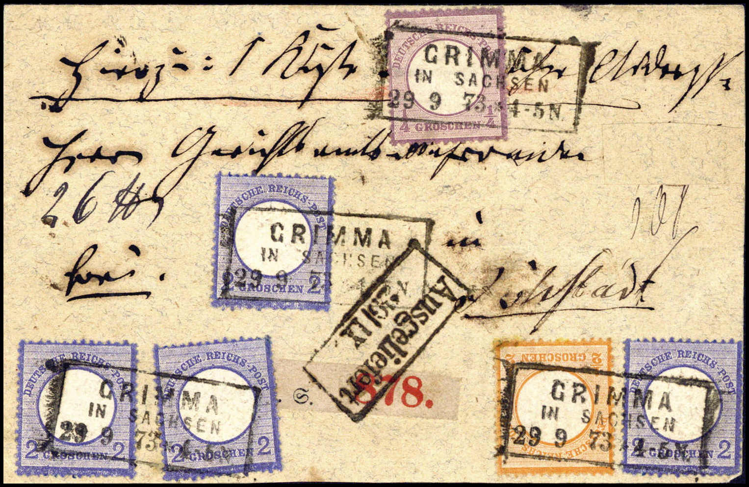 ¼ Gr. mit ½ Gr. orange und viermal 2 Gr. blau, vorzüglich frische, außergewöhnliche Frankatur-Kombination auf Paketbegleitbrief nach Jöhstadt (leichte Beförd.-Spuren), R3 GRIMMA IN SACHSEN 29/9 73, Fotobefund Sommer BPP