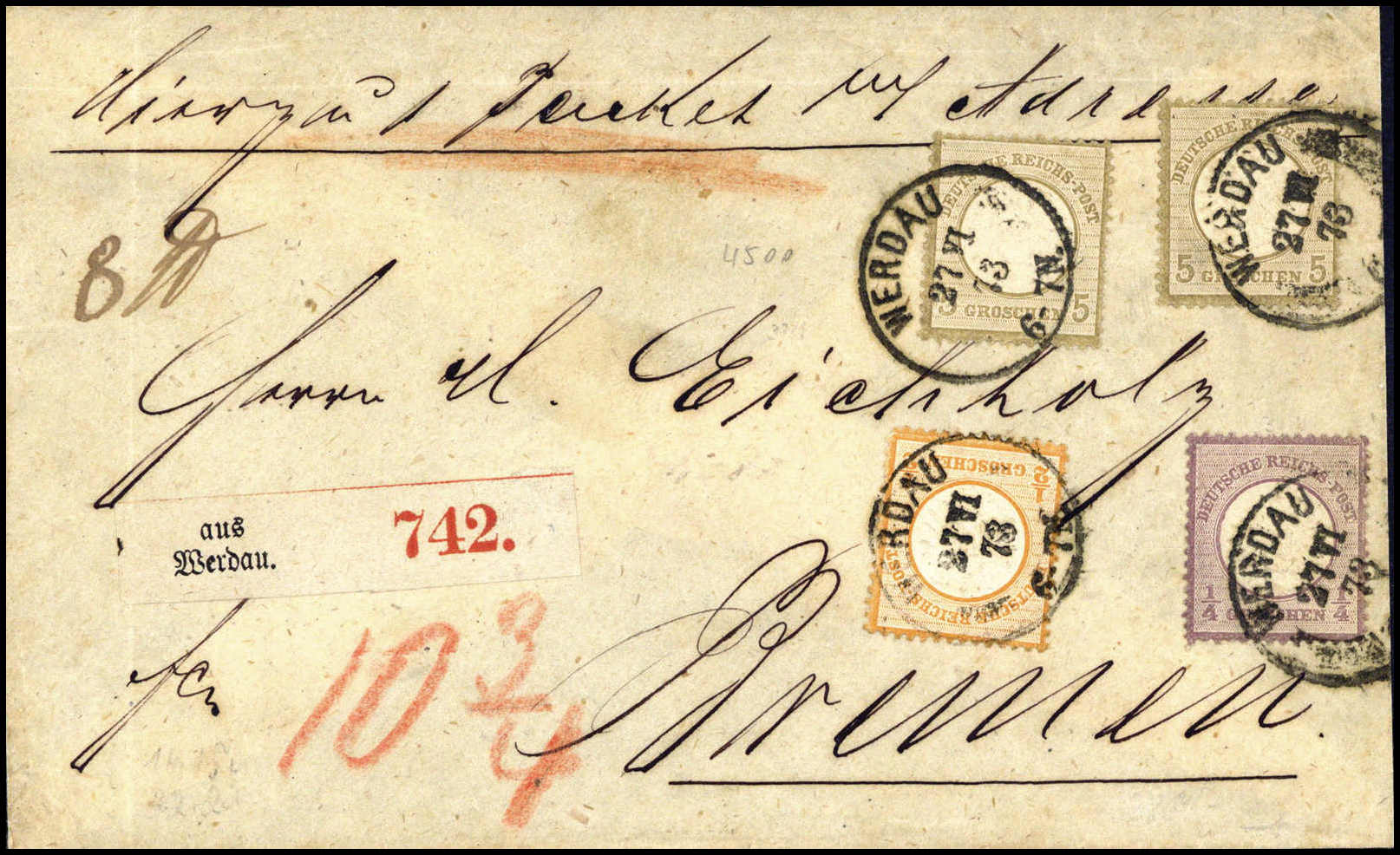 ¼ Gr. mit ½ Gr. orange und zweimal 5 Gr. ockerbraun, Kabinettstücke auf sauberem Paketbegleitbrief nach Bremen, zentr. K1 WERDAU 27/6 73, Fotobefund Sommer BPP