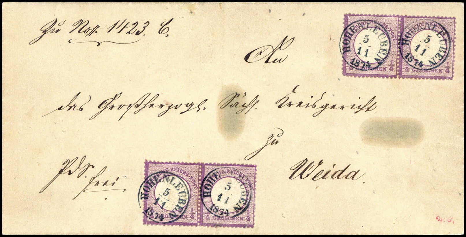 ¼ Gr., zwei waagr. Paare mit dekorativ aufgesetzten, blauen Taxis-K1 HOHENLEUBEN auf Brief nach Weida. Zwei Marken kl. Mängel. Ex. Sammlung Traber und Volny, Fotoattest Krug BPP