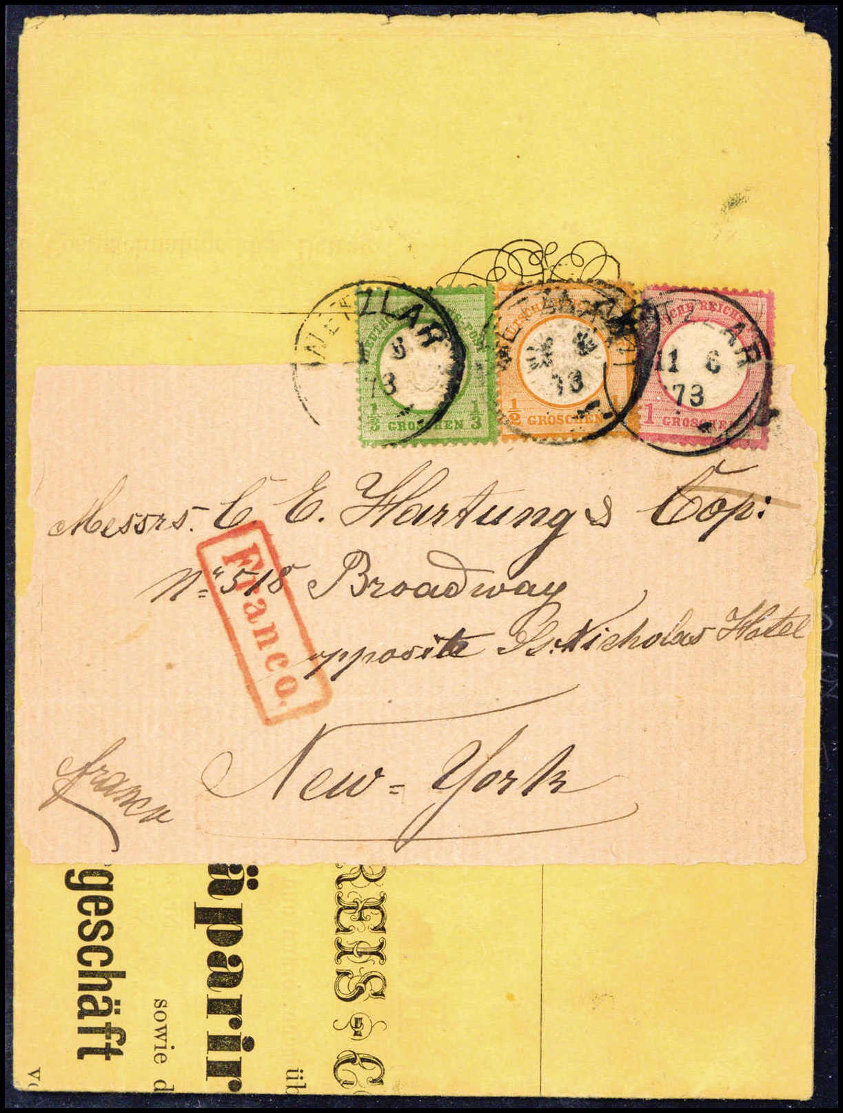 Drucksachen-Frankatur in die USA: 1/3 Gr. mit 1/2 Gr. orange und 1 Gr. karminrosa, dekorative und frisch erhaltene Dreifarben-Frankatur auf gelber Drucksache mit weißer Adreßschleife (diese nur vs. erhalten) nach New York. Zentr. Stempel