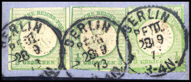1/3 Gr., Mischfrankatur mit zwei Ganzs.-Ausschnitten 1/3 Gr. kl. Schild, auf schönem blauem Bfstk. mit zentr. K1 BERLIN P.E. III 28/9 73. Trotz kl. Mängel eine sehr seltene Mischfrankatur, Fotoattest Hennies BPP