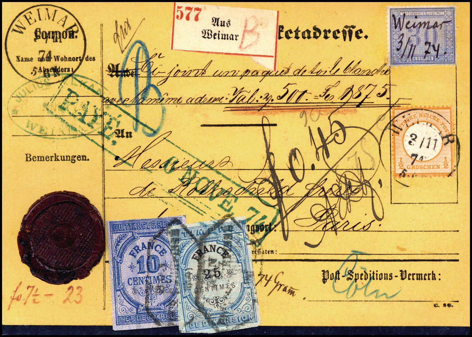 ½ Gr. mit NDP 30 Gr. blau auf kpl., gelber Wert-Paketkarte mit K1 WEIMAR 3/11 74 bzw. hs. Entwertung nach Paris mit zwei zugeklebten franz. Steuermarken. Eine selten schöne Paketkarte, Fotoattest Sommer BPP