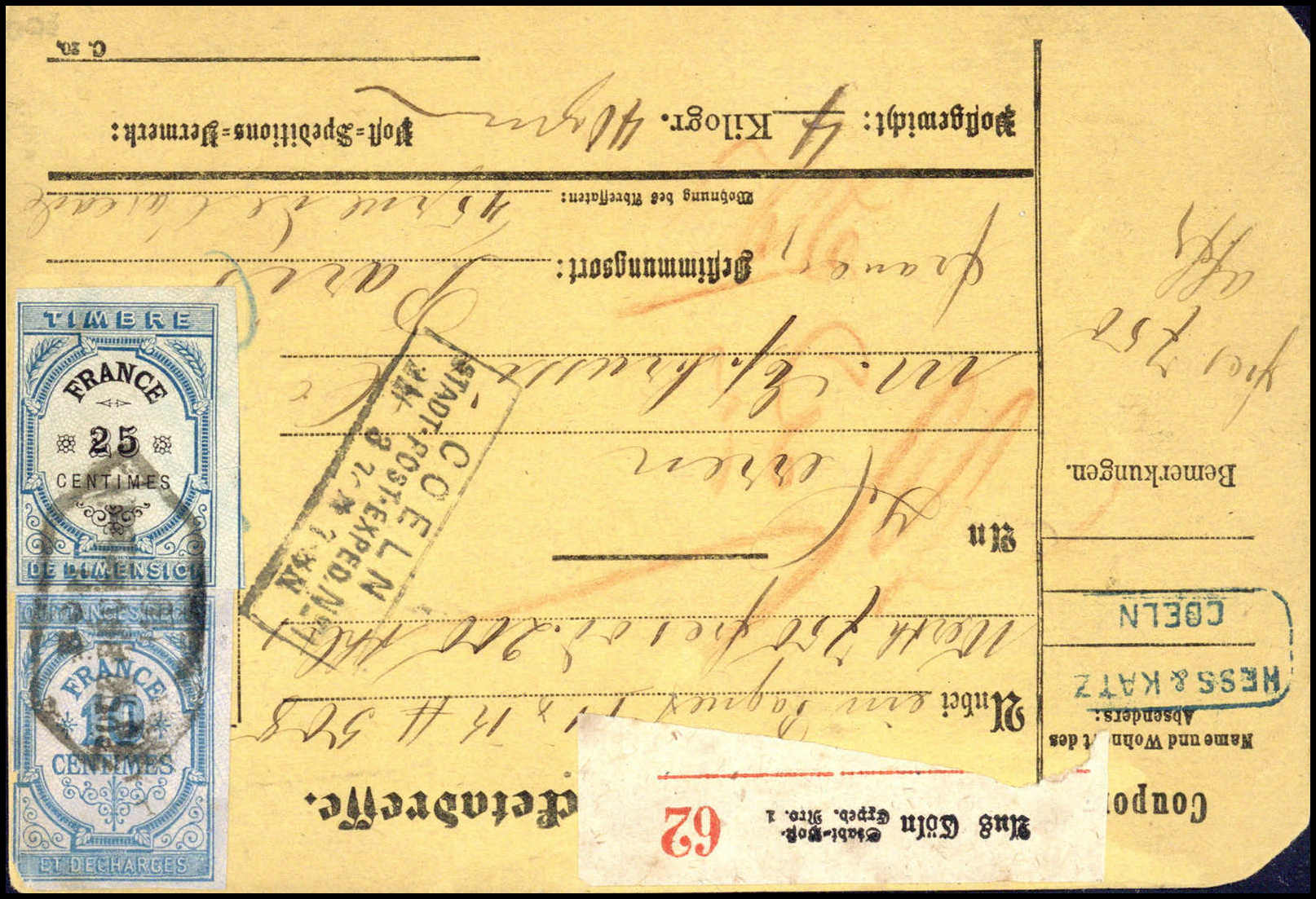 ½ Gr., unentwertetes Exemplar zusammen mit fünfmal 5 Gr. graubraun rs. auf Wert-Paketkarte nach Paris (Beförd.-Spuren) mit Stempel COELN STADT-POST-EXPED No.1, vs. zwei franz. Steuermarken