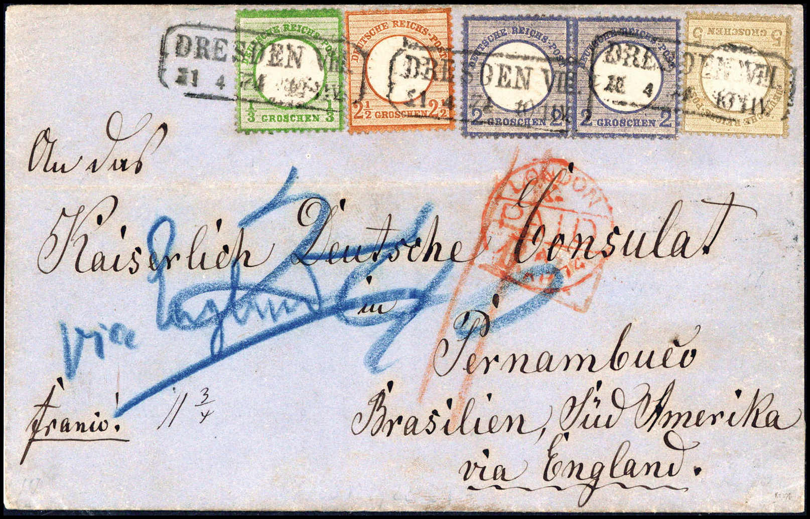 völlig tadelloser Erhaltung auf schönem blauem Faltbrief nach Pernambuco/Brasilien. Leitvermerk "via England", klare R2 DRESDEN VIII 11/4 74, vs. mit Durchgangsstempel von London sowie brasilianischer Eingangs-Taxe "240" (Reis). Ein bemerkenswertes
