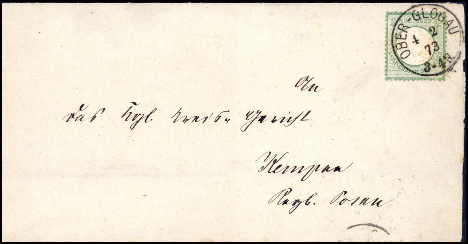 1/3 Gr. dunkelsmaragdgrün, schöne Farbe, Kabinettstück mit gestochen klarem K1 OBER-GLOGAU auf Drucksache. Katalogpreis: 400,-