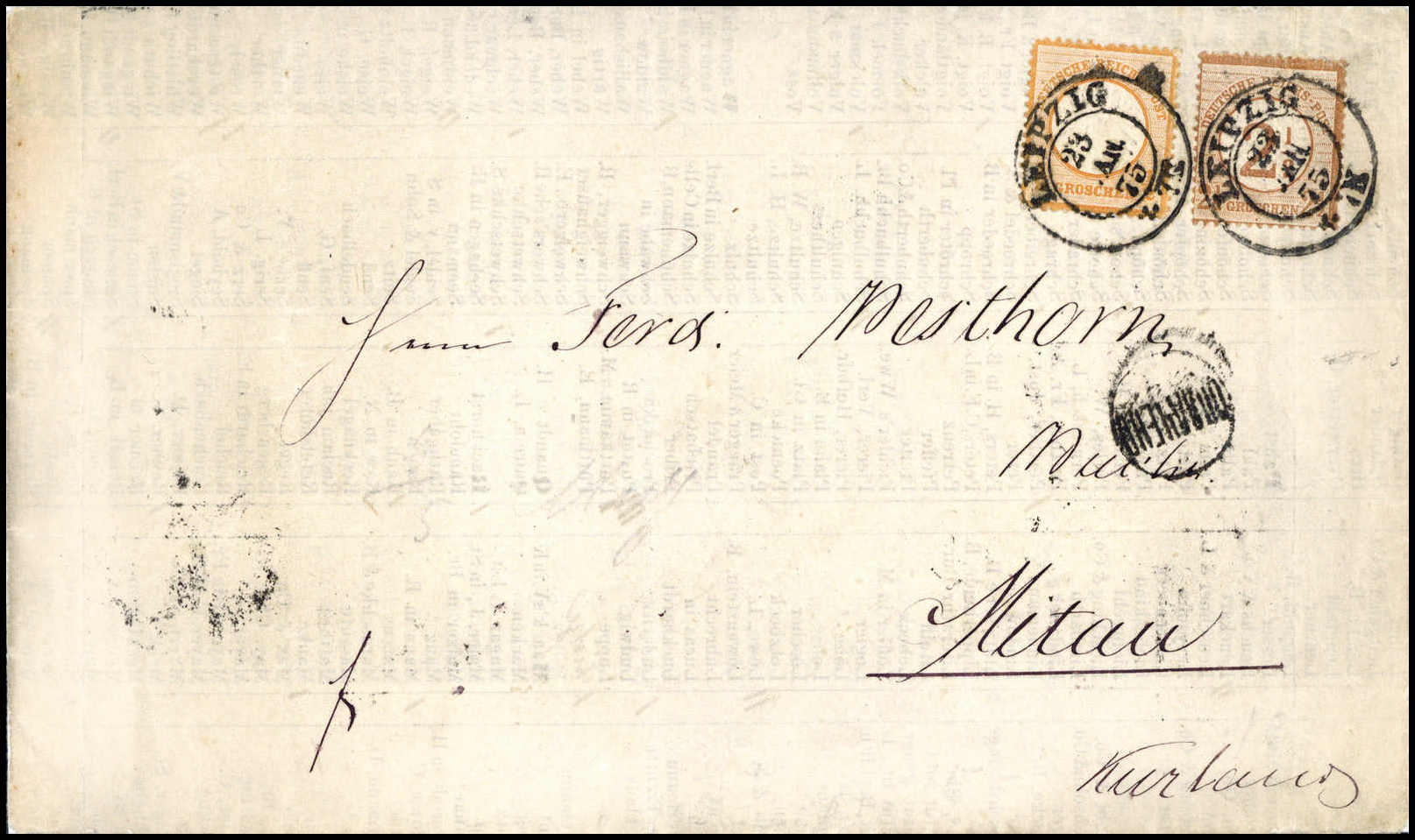 ½ Gr. mit 2½ a. 2½ Gr., rötlichbraun auf seltenem Brief nach Mita/Kurland/Russland (2½ Gr. winz. Druckspur vom Brief), klare K2 LEIPZIG 23/1 75 (Pfennigzeit). Ein attraktives Ganzsstück, Fotobefund Sommer BPP