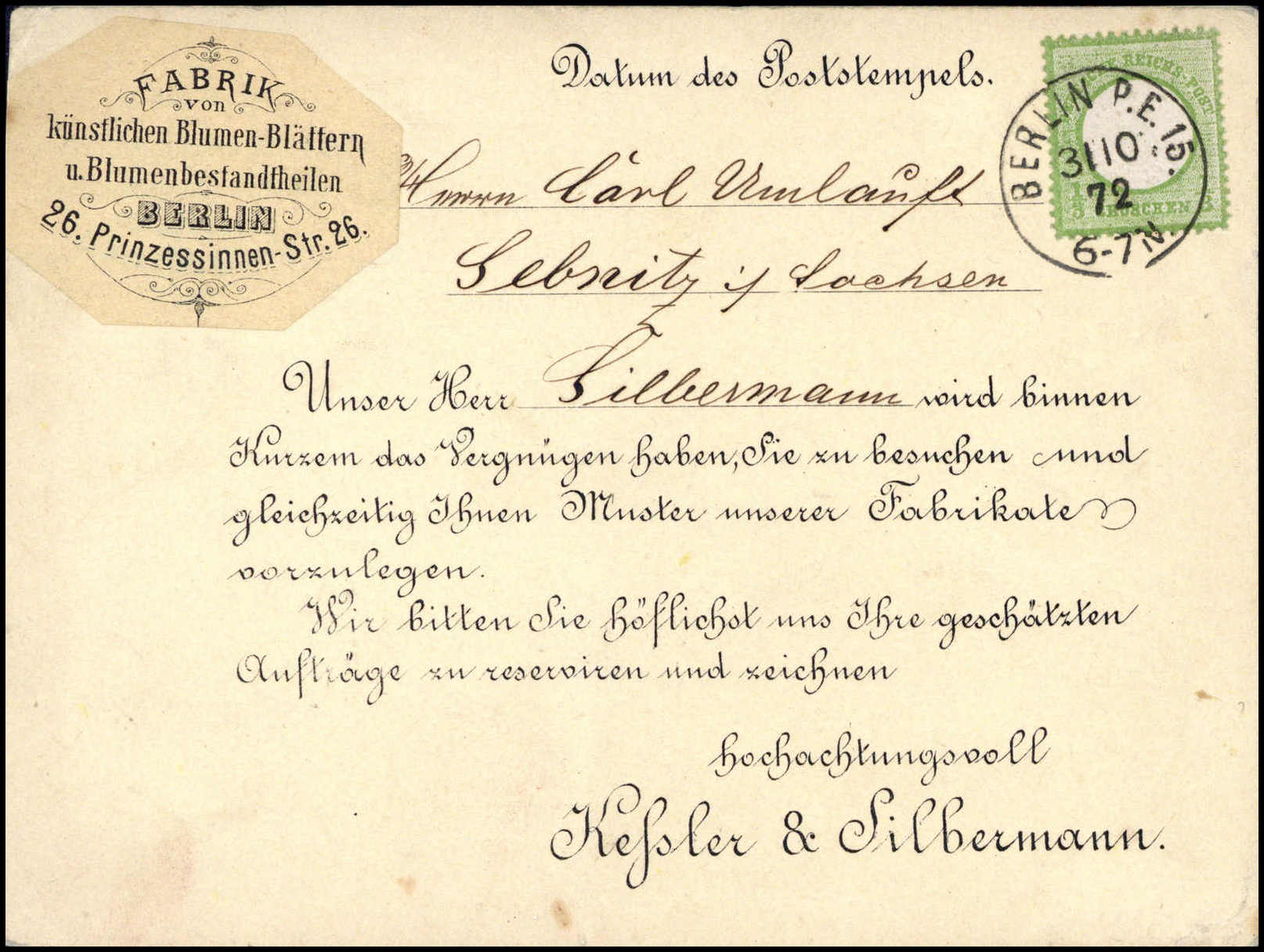 1/3 Gr., Luxusstück mit idealem K1 BERLIN P.E.15 auf dekorativer, vorgedruckter Vertreterkarte einer Kunstblumenfabrik, Fotoattest Sommer BPP