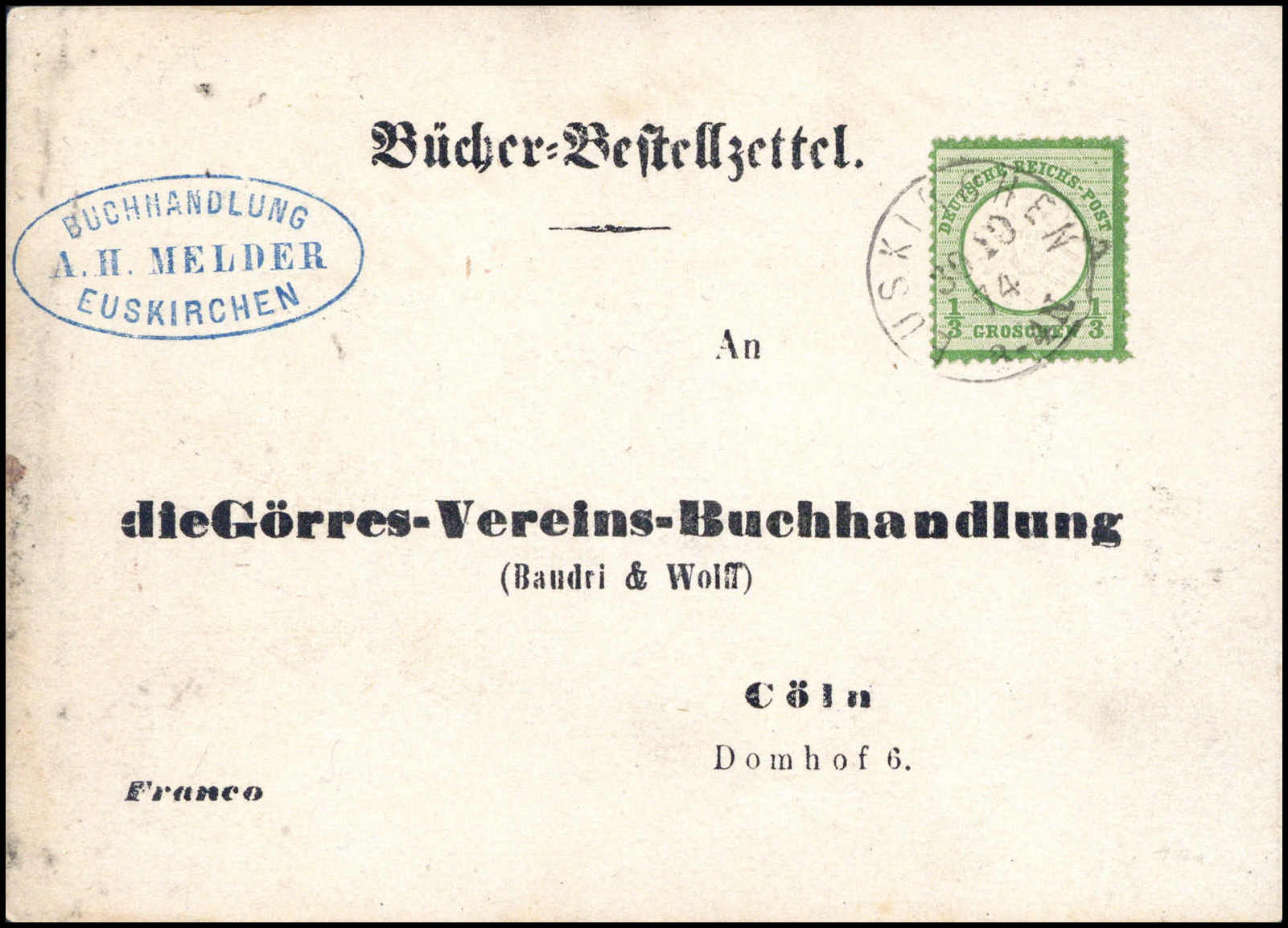 1/3 Gr., besonders tieffarbiges Kabinettstück mit klarem K1 EUSKIRCHEN auf vorgedrucktem Bücherbestellzettel, Fotobefund Krug BPP