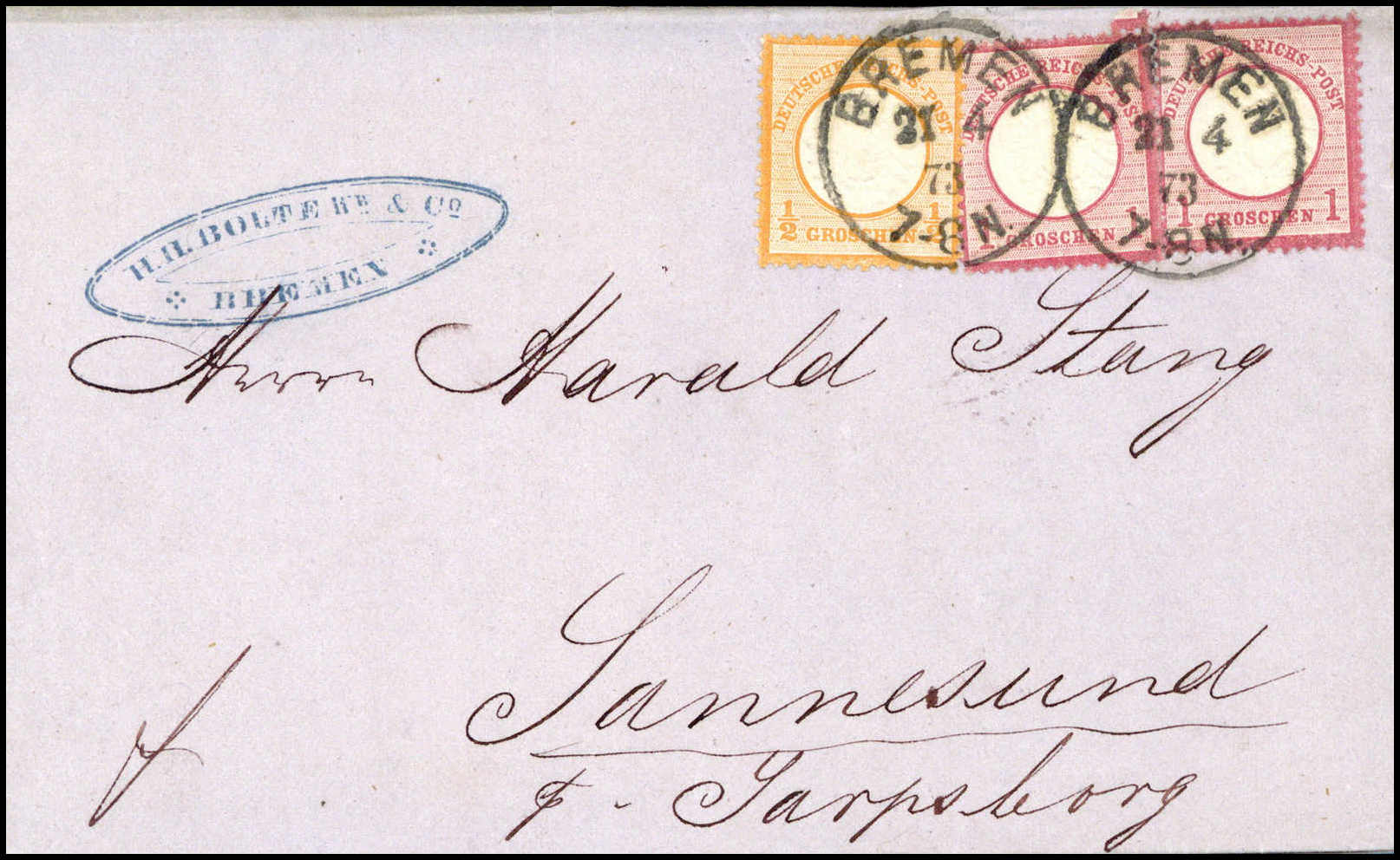 ½ Gr. mit zweimal 1 Gr. karminrosa auf frischem Luxusbrief nach Norwegen, klare K1 BREMEN 21/4 73, Fotobefund Sommer BPP