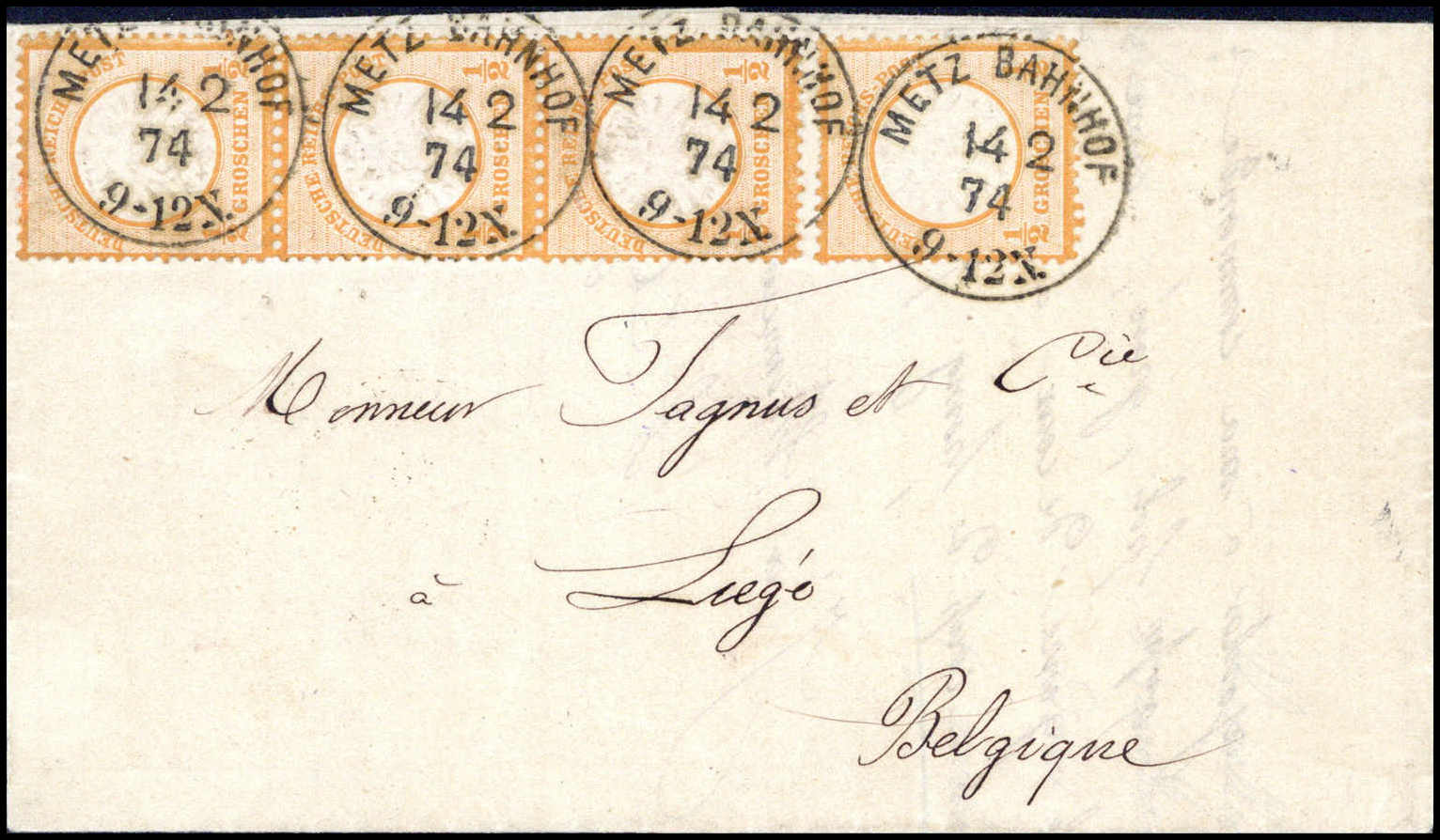 ½ Gr,. senkr. Dreierstreifen und Einzelstück auf aktenfrischem weißem Luxusbrief nach Belgien, ideal klare K1 METZ BAHNHOF 14/2 74, sign. Hennies BPP