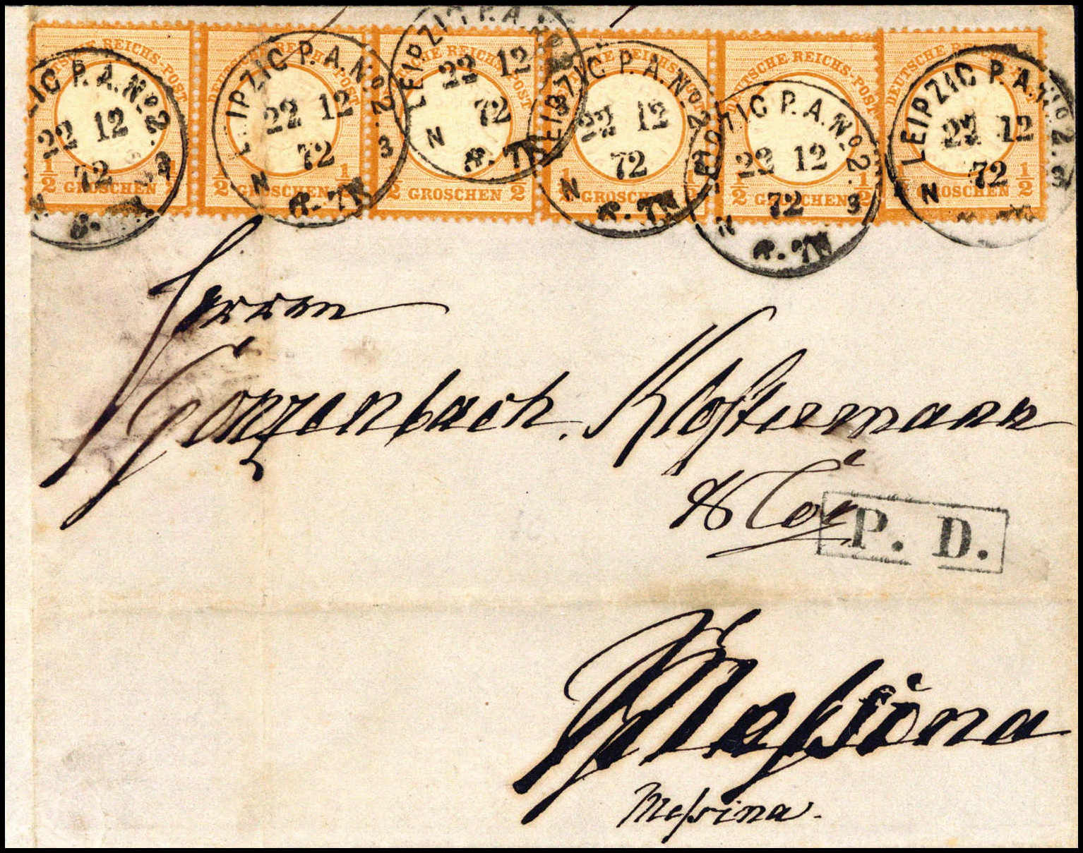 ½ Gr., waagr. Fünferstreifen und Einzelstück auf blauem Faltbrief nach Italien, klare K1 LEIPZIG 22/12 72. Trotz kl. Mgl. ein interessanter und seltener Brief, Fotoattest Brugger BPP