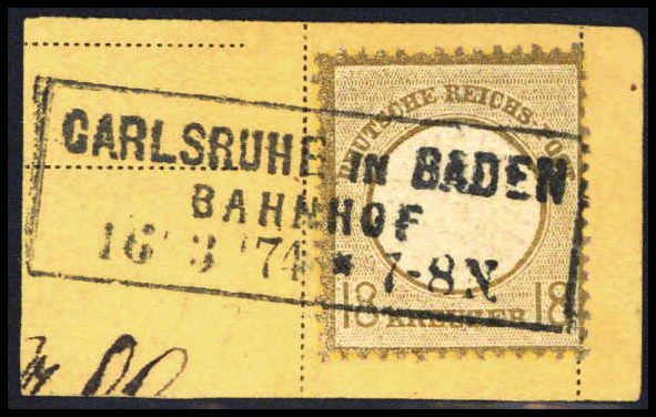 18 Kr., Kabinett-Briefstück mit klarem R3 CARLSRUHE IN BADEN BAHNHOF 16/3 74, doppelt sign. Hennies BPP. Katalogpreis: 2.800,-
