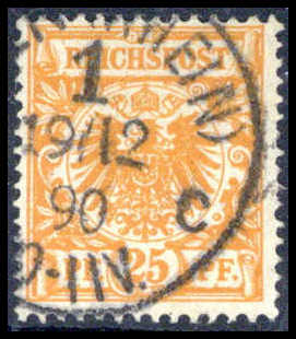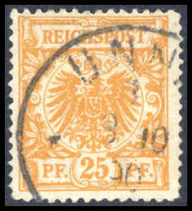25 Pfg., goldgelb, klar gestempelt "UNNA 9.10 90", doppelt signiert Zenker BPP. Katalogpreis: 450,-