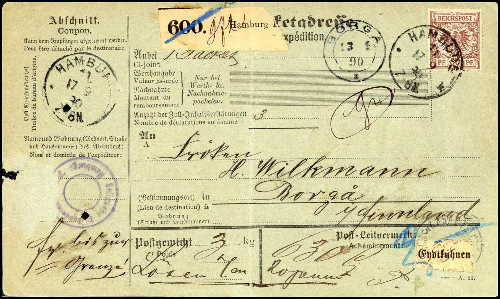 50 Pfg., Einzelfrankatur auf kpl. grüner Paketkarte nach Borga/Finnland (Beförd.-Spuren), klare Stempel HAMBURG 11k 17/9 90. Seltene teilfrankierte Paketkarte bis zur deutschen Ausgangsgrenze, wie es ab 1889 für Sendungen nach