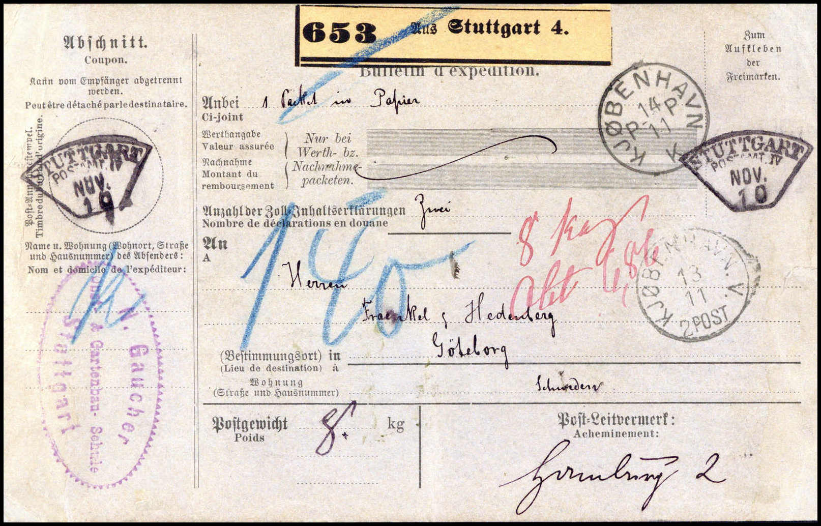 1890, kpl. Paketkarte mit Fächerstempel STUTTGART POSTAMT IV 10/11 via Hamburg und Kopenhagen nach Göteborg/Schweden. Am Empfangsort nachfrankiert mit schwed. Portomarken zu insges. 6,86 Kronen. Sehr selten