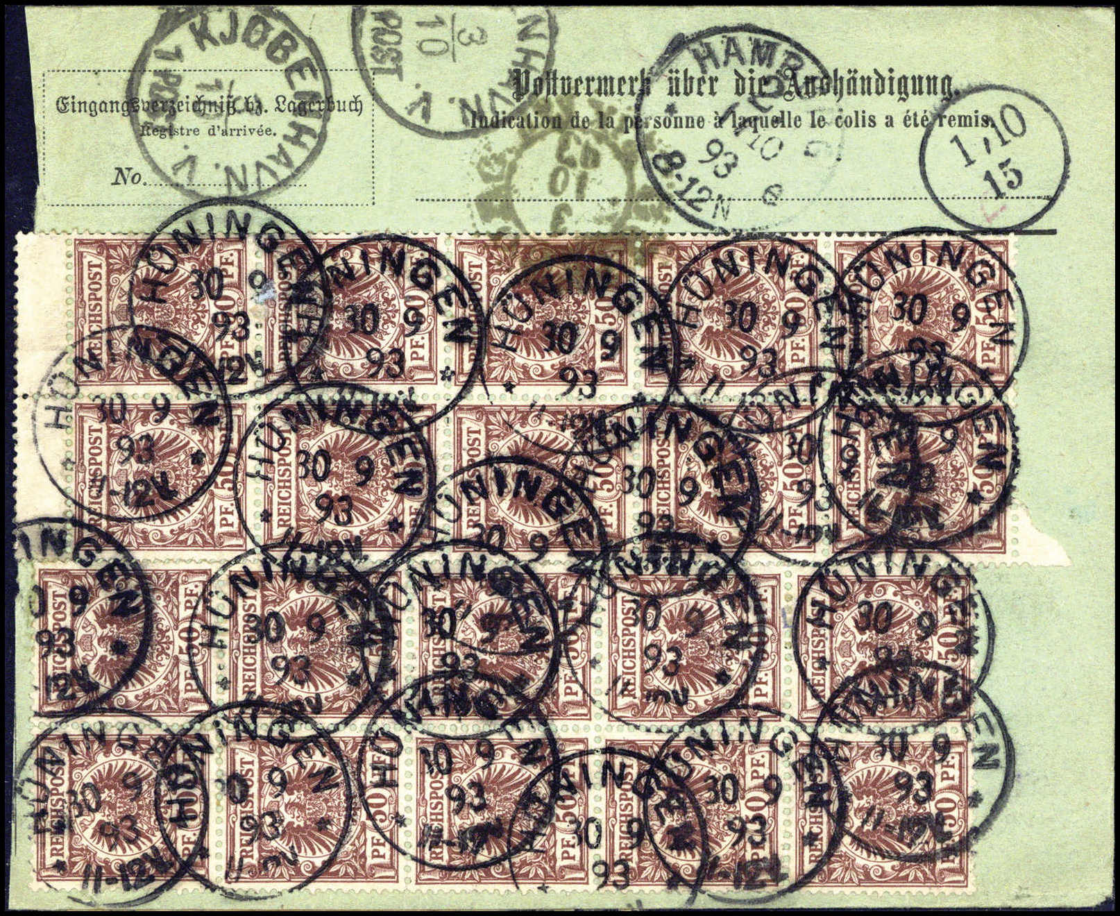 20 Pfg., drei Exemplare mit 24 Exemplaren der 50 Pfg. lilabraun (dabei zwei Zehnerblocks) auf Paketkarte für drei Sendungen nach Schweden, klare K1 HüNINGEN 10/9 93. Ein interessantes Stück, Fotobefund Petry BPP