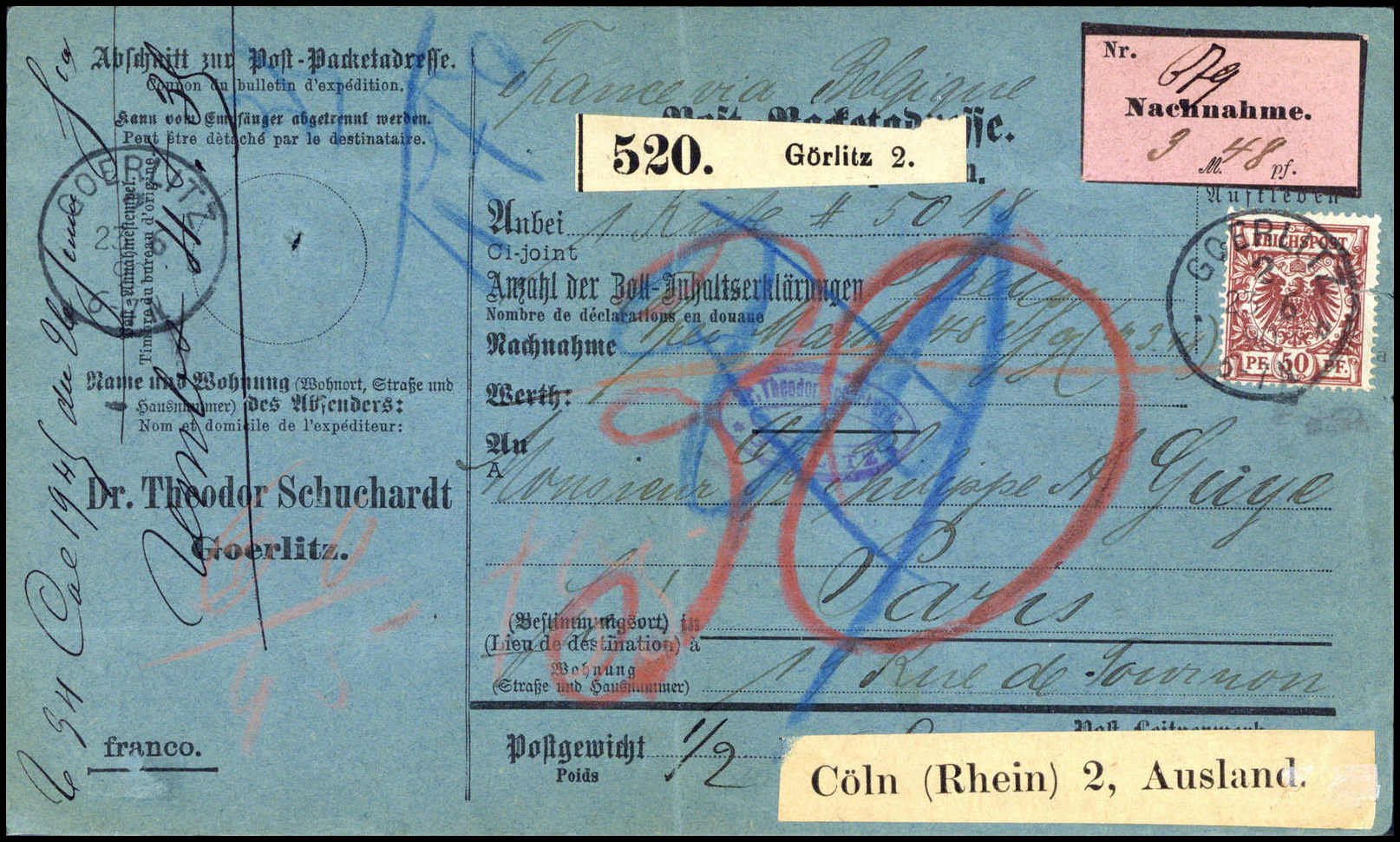 50 Pfg. feuerrot, drei Exemplare mit 5 Pfg. dunkelgraugrün vs. und rs. auf Nachnahme-Paketkarte mit Stempel GOERLITZ 23/6 90 nach Paris, zusätzl. zwei franz. Steuermarken zu 10 und 25 C. Trotz kl. Mängel eine seltene Karte, doppelt sign.