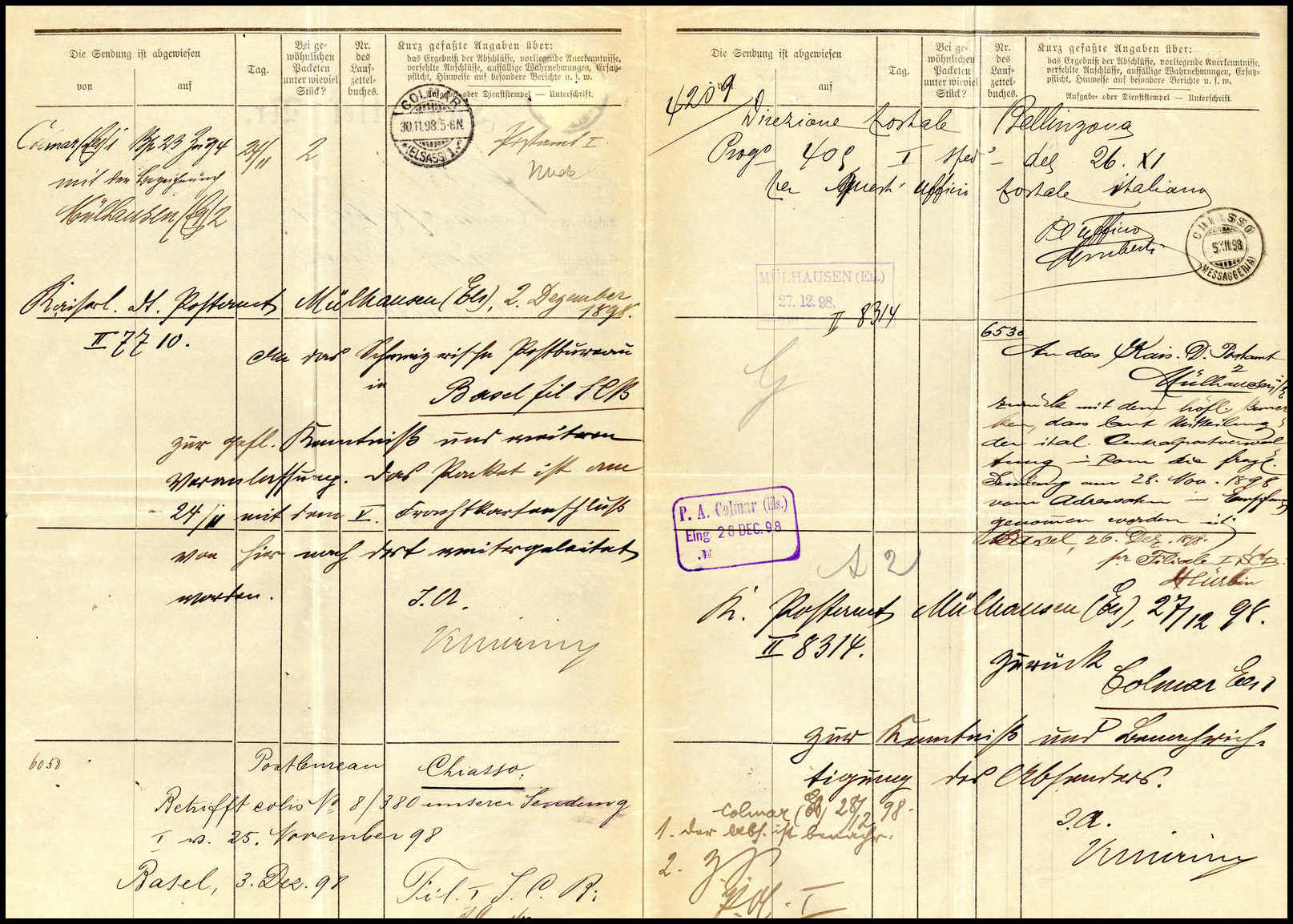 20 Pfg., Einzelfrankatur mit zentr. Stempel COLMAR 30/11 98 auf sehr seltenem, vorgedrucktem Laufzettel über Mühlhausen/Elsaß nach Capriate