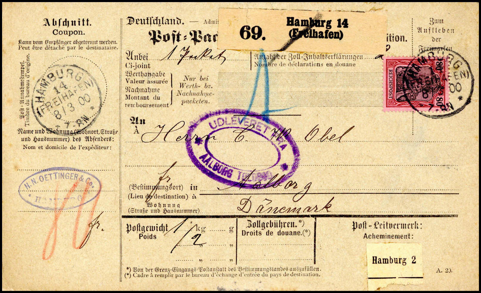 80 Pfg., Einzelfrankatur mit klarem Stempel HAMBURG 14.FREIHAFEN 8/3 00 auf Paketkarte nach Dänemark