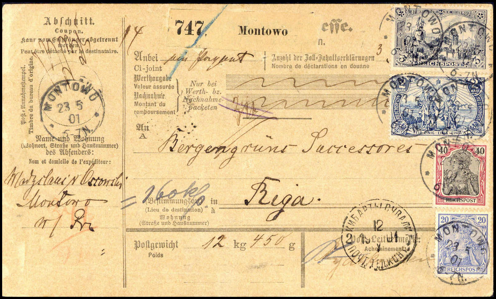3 Mk. (½ Z.) mit 2 Mk. sowie 20 und 40 Pfg. auf kpl. Paketkarte nach Riga/Russland, klare K1 MONTOWO 23/5 01