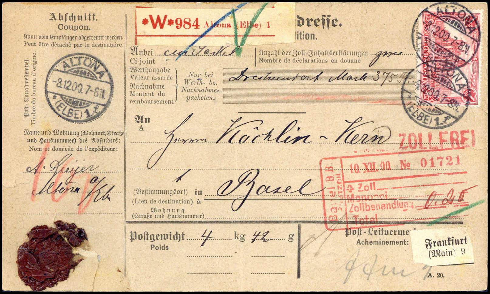 1 Mk., tadellose Einzelfrankatur auf kpl. Auslands-Wertpaketkarte über 300,- Mark von Altona 8/12 00 in die Schweiz (Beförd.-Spuren). Katalogpreis: 750,-