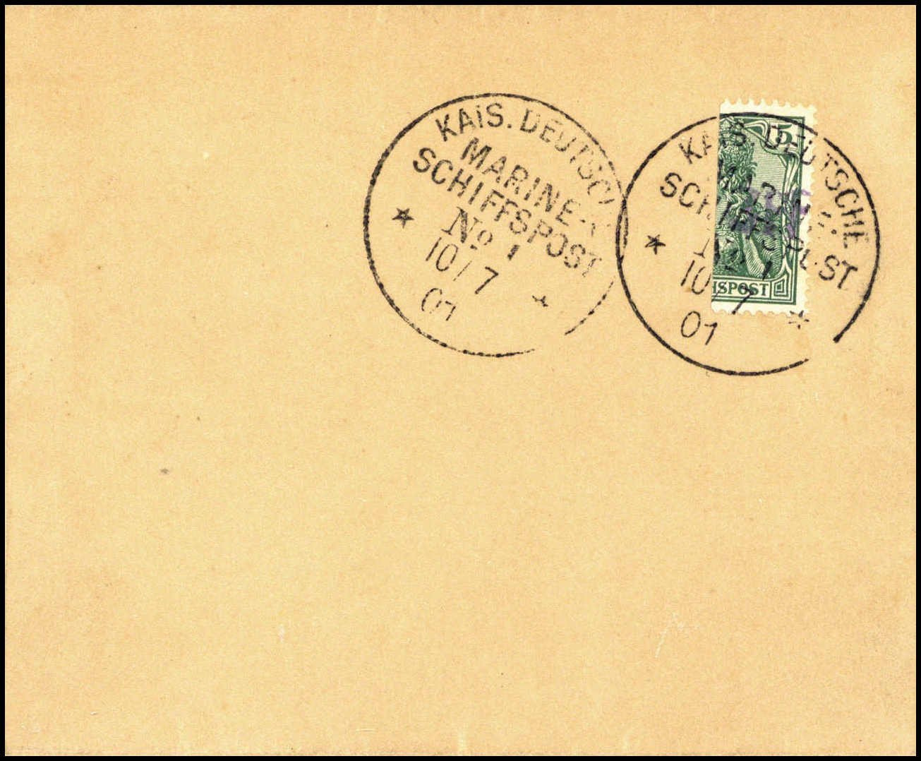 3 PF a. halbierter 5 Pfg. Germania, rechte Hälfte, tadellose Einzelfrankatur mit besonders kräftigem, violettem Handstempel-Aufdruck auf Streifband, zwei klar aufges. Stempel K.D. MARINE-SCHIFFSPOST No.1 ("Vineta")10/7 01. Sehr schönes