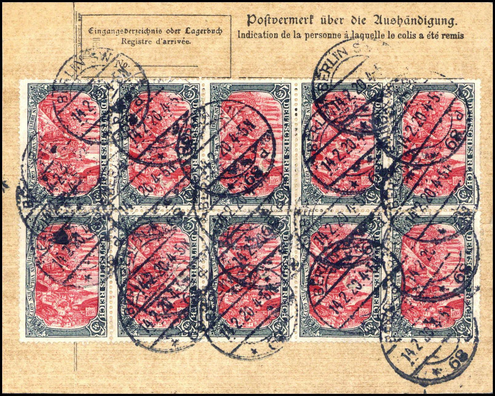 5 Mk., 23 Exemplare (davon 20 auf offiziellem Beiblatt mit Eindruck "Reichs-Postverwaltung") zusammen mit 40 Pfg. und 2,50 Mk. auf Wert-Paketkarte über 8.000,- Mark in die Schweiz, klare Stempel ILMENAU 12/4 20. Selten, sign.