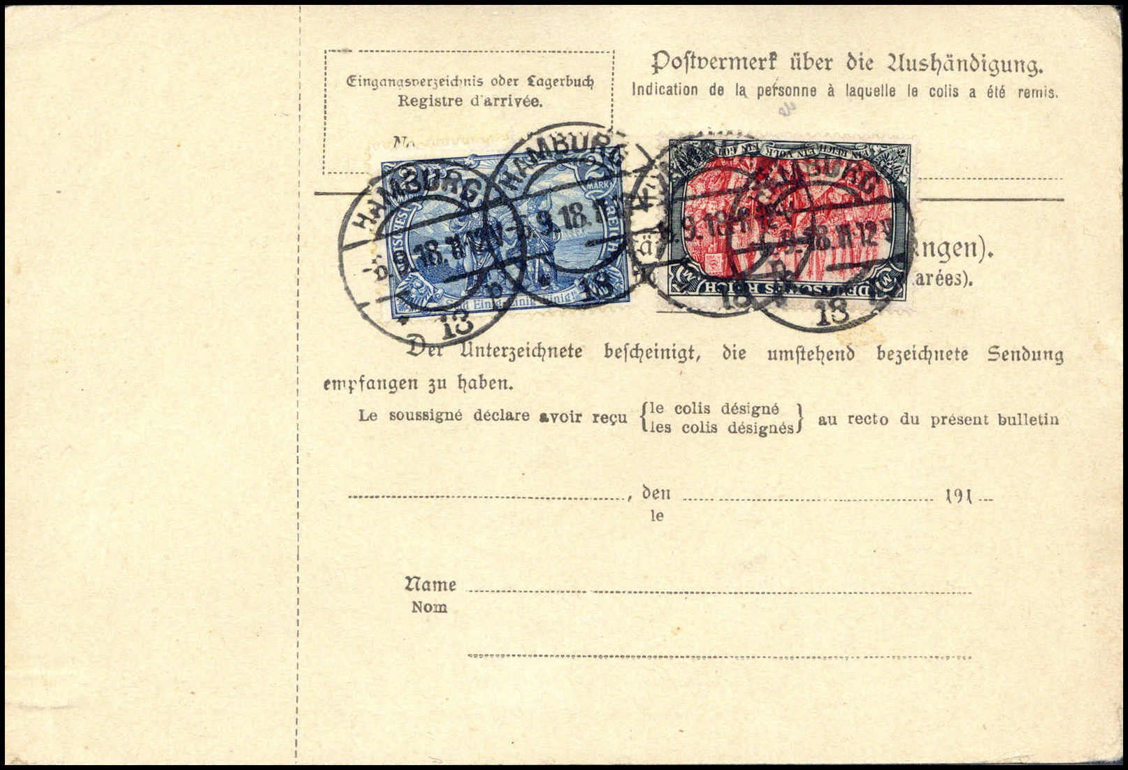 5 Mk. mit 2 Mk. rs. auf vorgedruckter Paketkarte nach Konstantinopel, klare Stempel HAMBURG 6/9 18