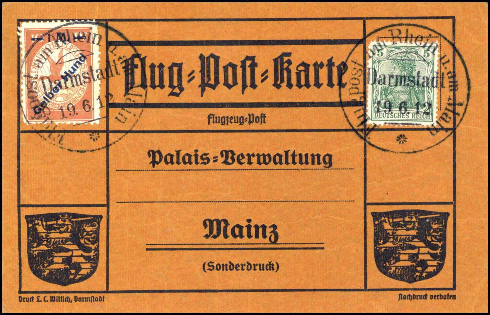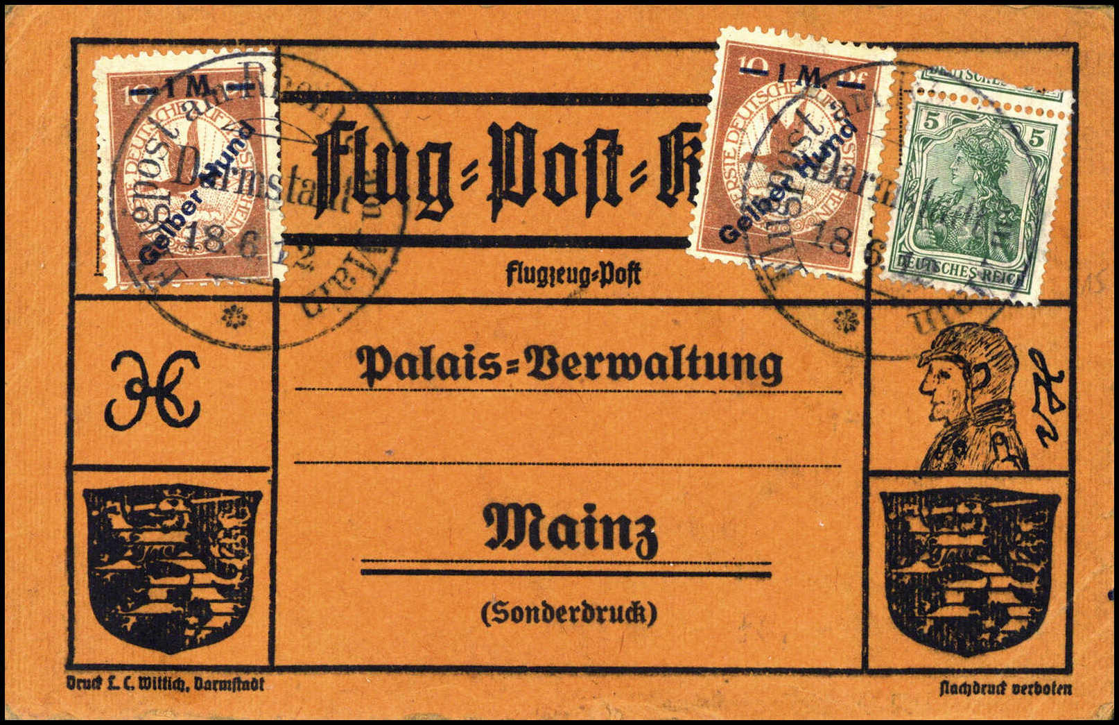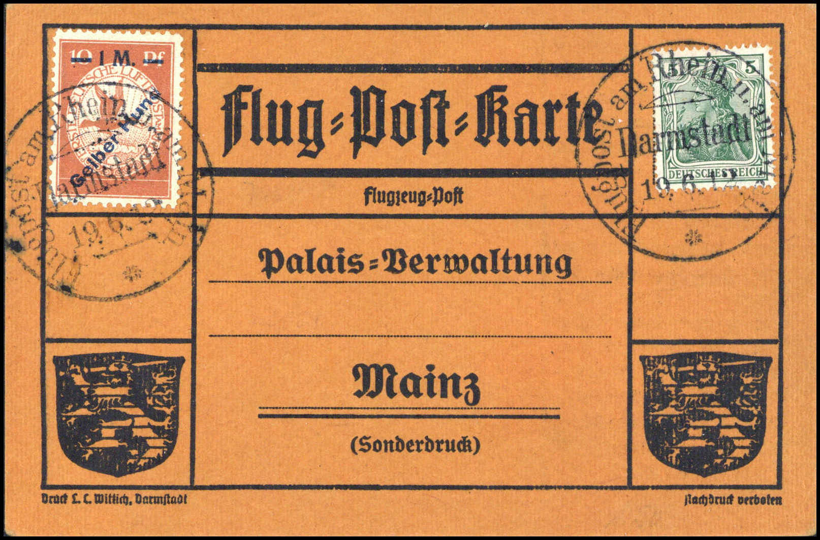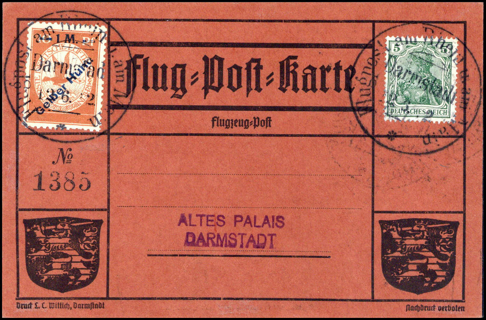 Gelber Hund mit Germania 5 Pfg. auf offizieller Flugkarte mit SST von Darmstadt. Dazu eine seltene ungebr. Flugkarte
