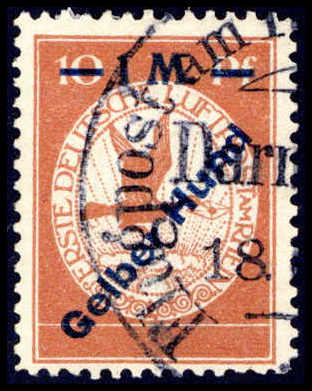 1 M. a. 10 Pfg., Aufdruckfehler "Huna", mit Germania 5 Pfg. auf tadelloser Flugkarte mit SST von Darmstadt, sign. Brettl BPP