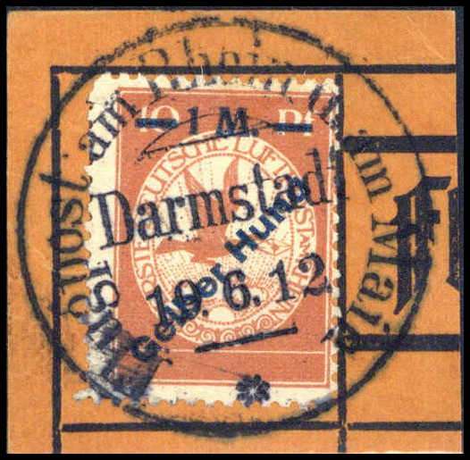 1 Mk. a. 10 Pfg., Aufdruckfehler: "Huna", mit Germania 5 Pfg. sowie rs. senkr. Paar derselben Marke mit normalem Aufdruck auf roter Flug-Sonderkarte mit SST DARMSTADT