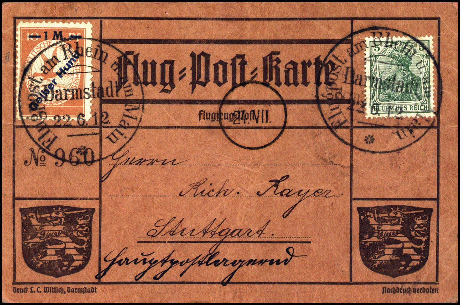 "Roter Hund"-Karte mit Plattenfehlern auf jeder Marke, 1 Mk. a. 10 Pfg., drei Exemplare vs. und rs. mit Germania 5 Pfg. auf offizieller Flugkarte nach Stuttgart (Knitterspuren). Ideale Stempel DARMSTADT 22/6 12. Alle drei Marken weisen