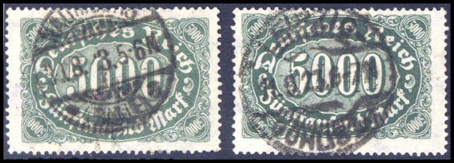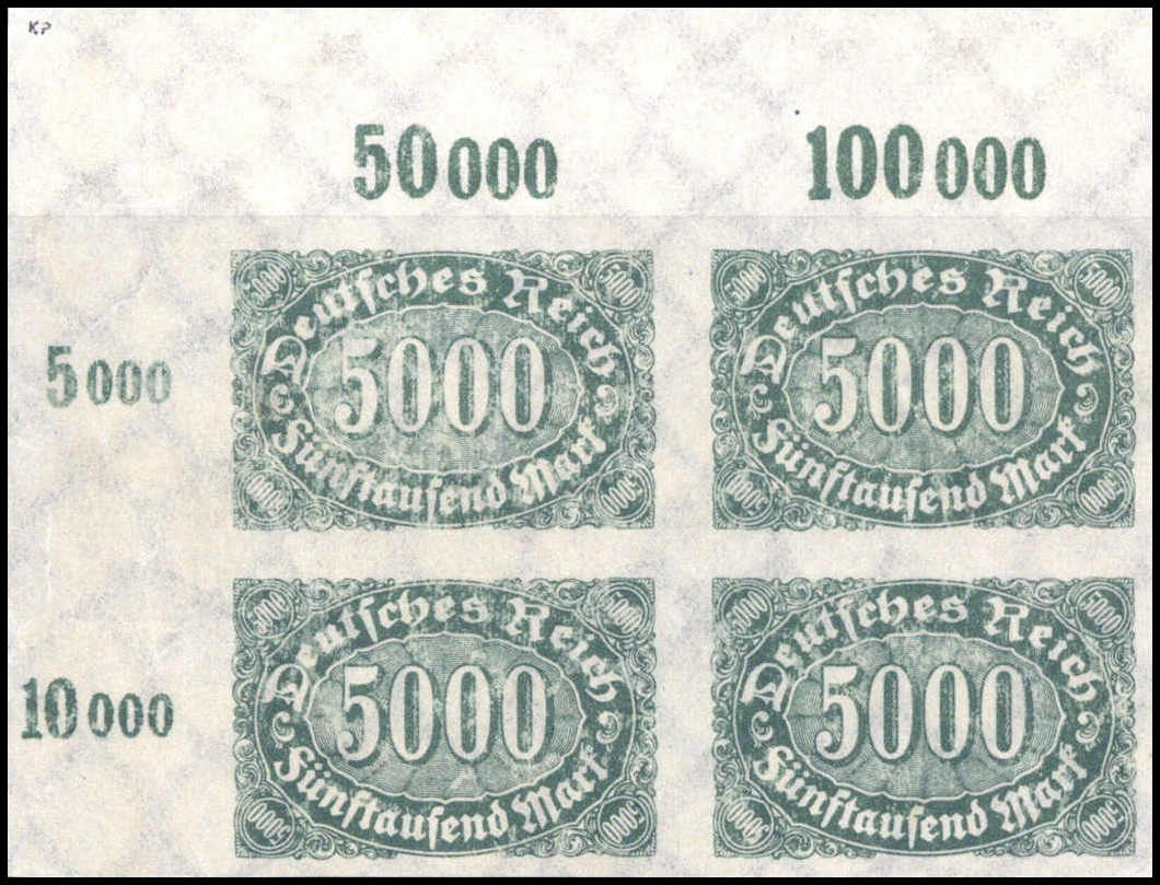 5000 Mk, alle Farben, tadellos gestplt., signiert Infla, und die d-Farbe zusätzlich mit Kurzbefund Meyer BPP. Katalogpreis: 255,-
