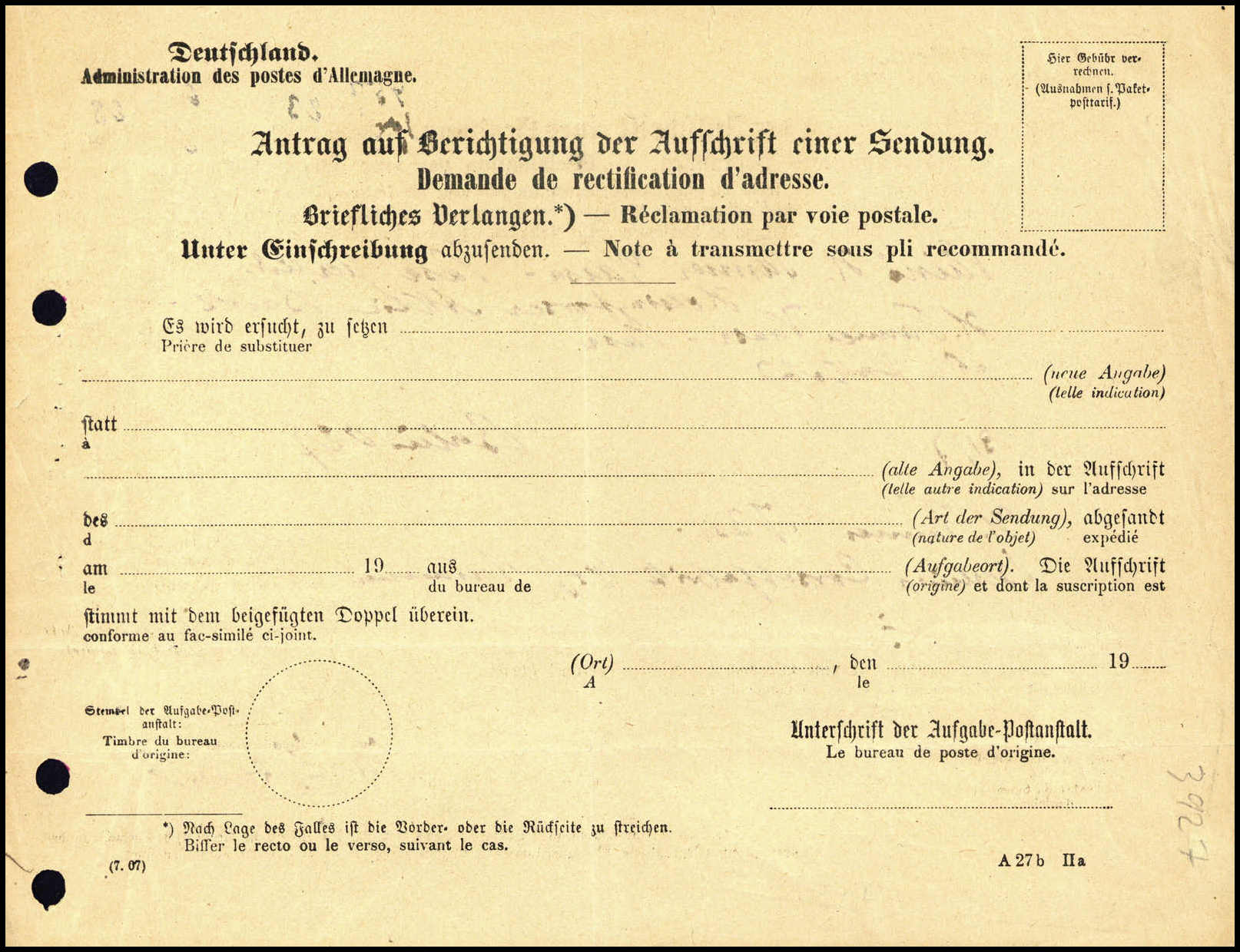 500 Mk. und zweimal 2.000 Mk. auf gef. und am Rand gelochtem Postformular "Antrag auf Berichtigung der Aufschrift einer Sendung" mit Formularstpl. vom 2.8.23 für eine Änderung der Aufschrift eines Pakets nach Finnland. Eine