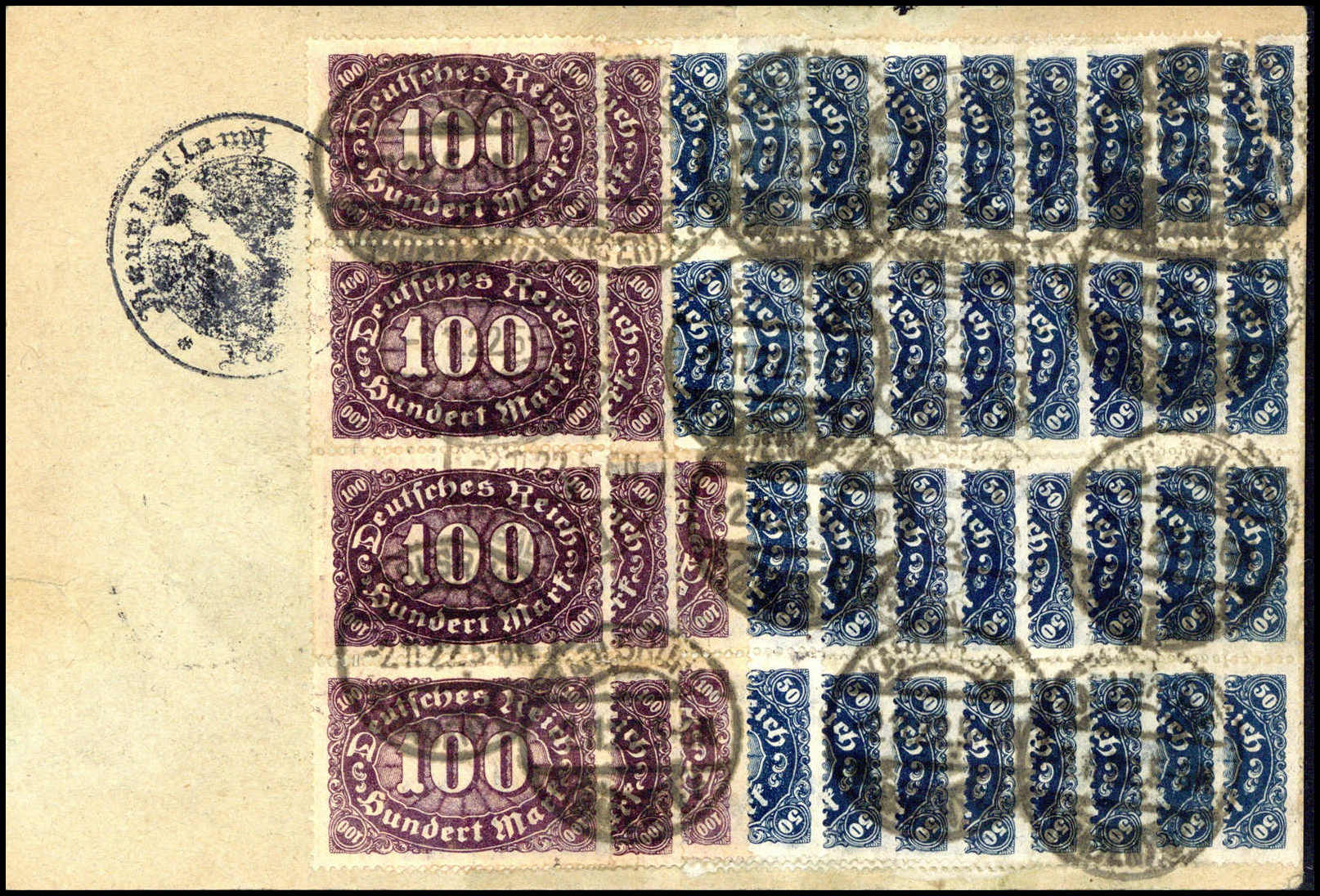 Treppenfrankatur 50 Mk., 36 Exemplare sowie zehnmal 100 Mk. als stark übereinander geklebte Treppenfrankatur rs. auf Wert-Paketkarte von Karlsruhe (2.11.22) in die Schweiz