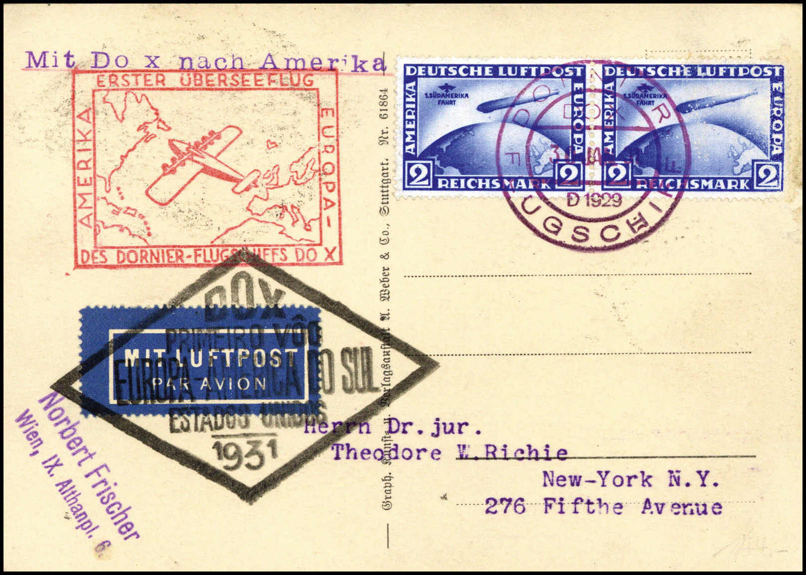 2 Mk., waagr. Paar (re. Marke Beförd.-Spuren) auf DOX-Postkarte nach New York, violetter K2 DORNIER FLUGSCHIFF 30/1 31. Katalogpreis: 900,-+