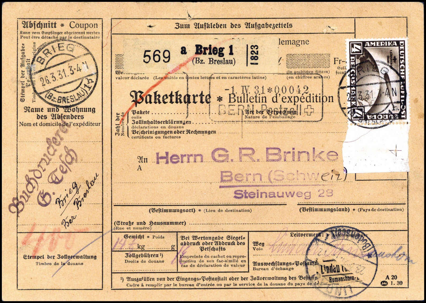 4 Mk., tadelloses, re. Bogenrandstück mit Passerkreuz auf kpl. Auslands-Paketkarte mit Stempel BRIEG 26/3 31 in die Schweiz