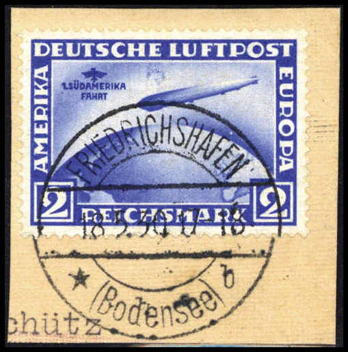2 Mk., Plattenfehler I ("Mond" über Luftschiff), tadelloses, besonders schön gestplt. Briefstück, sign. Schlegel BPP. Katalogpreis: 800,-+