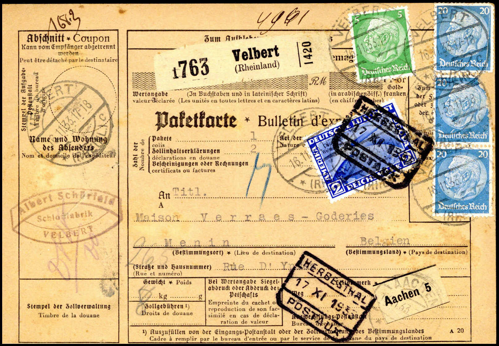 2 Mk. mit Hindenburg 5 Pfg. und dreimal 20 Pfg. (diese fehlerhaft) auf schöner, kpl. Paketkarte (16.11.33) von Velbert nach Belgien