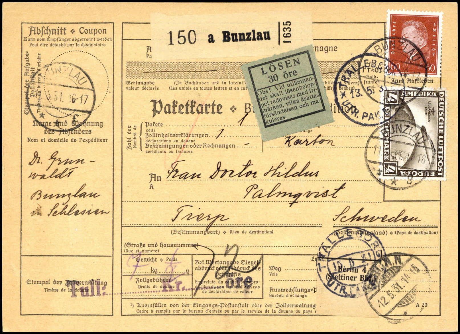 4 Mk. mit 60 Pfg. Ebert auf kpl. Auslands-Paketkarte von Bunzlau 11/5 31 nach Schweden. Trotz kl. Mängel eine seltene Frankatur. Katalogpreis: 800,-